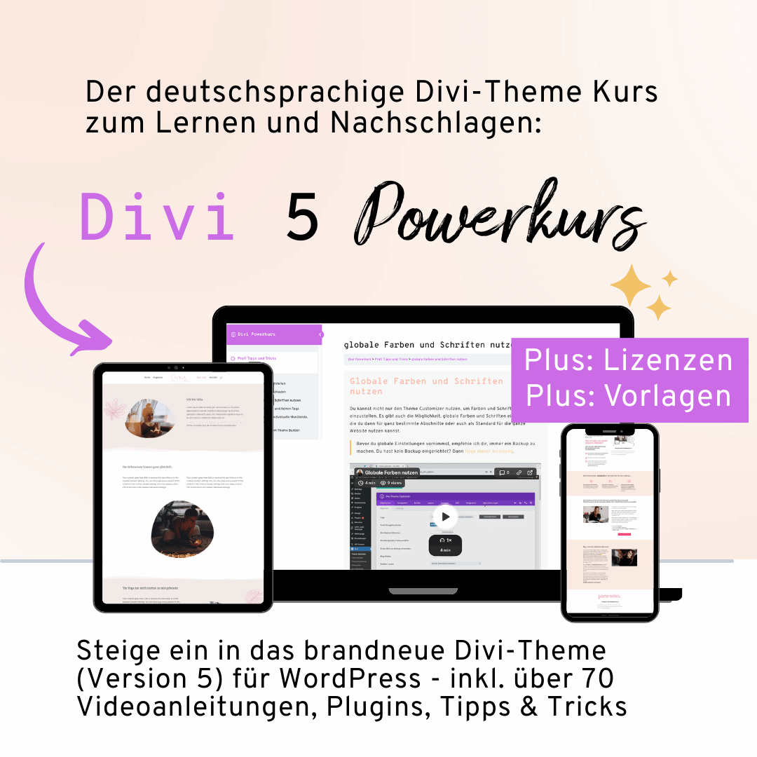 Gruppenprogramme: Website leicht gemacht Zu Website leicht gemacht Rock your Website Zu Rock your Website Kurse für das Divi-Theme: Divi Powerkurs Zum Divi Powerkurs Divi 5 Powerkurs Zum Divi 5 Powerkurs Divi Quickstart Zu "Divi Quickstart" Vorlagen-Bundle: Divi Vorlagen-Bundle Zum Vorlagen-Bundle Kurse für die Website-Erstellung: Website Ready – Selbstlernkurs Zum "Website Ready Selbstlernkurs" Website Ready 2024 Zu "Website Ready 2024" Weekend Website mit Divi Zum Kurs "Weekend Website" Ergänzende Kurse und Minikurse: SEO leicht gemacht Zu "SEO leicht gemacht" Website-Konzept Zum Website-Konzept-Kurs Newsletter leicht gemacht Zum Newsletterkurs Weitere Kurse und Workshops: "Speed me up" Workshop "Website Starter Paket" "Website Ready" 2023 "Website Ready" 2022 "Weekend Website" (Happiness Bundle)